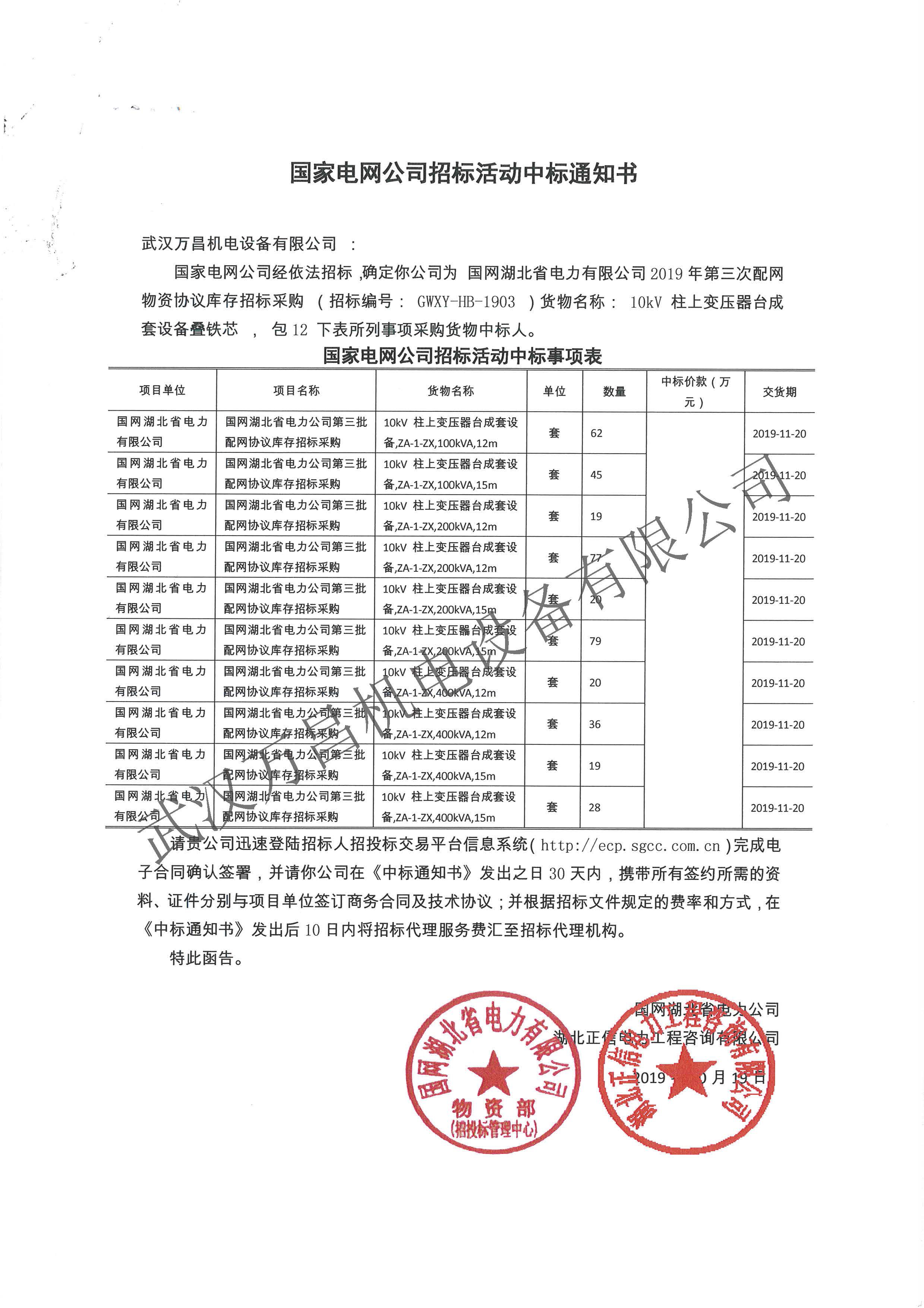 2019年中標(biāo)國(guó)網(wǎng)湖北省協(xié)議庫(kù)存項(xiàng)目